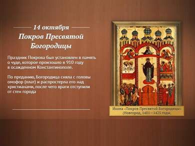 Таким образом, Покров Пресвятой Богородицы представляет собой православный праздник с древней историей и традициями, окруженный приметами и верованиями. Проводить этот день нужно в церкви и молитве, а вот работать нельзя.