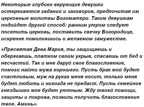 Пока одни девушки занимались гаданиями на Покров Богоматери, другие приближали свадьбу решительнее: проводили ритуалы, нашептывали заговоры на привлечение суженого. Ниже – несколько простых, но при этом действенных молитв Богоматери и народных заговоров, которые можно применить современницам.