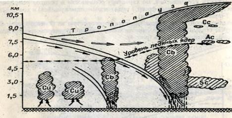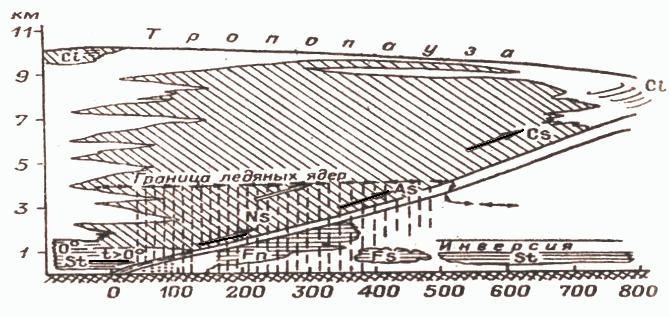 Система облаков мощного холодного фронта представлена на рис. 55. Как легко заметить, профили теплого (рис. 54) и холодного (рис. 55) фронтов заметно отличаются друг от друга. Это происходит потому, что при движении теплый воздух в нижнем слое вследствие трения о земную поверхность растягивается в направлении, обратном движению. Между тем холодный фронт вследствие трения в нижнем 1-2-километровом слое становится более крутым.