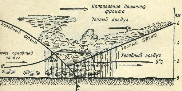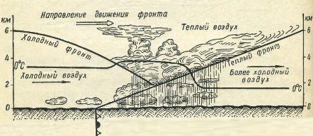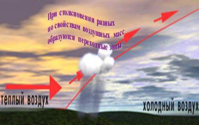 Так как холодные и теплые массы воздуха имеют различную плотность, они располагаются по отношению друг к другу не вертикально, а наклонно. Холодный воздух, как более плотный и тяжелый, вклинивается под теплый, более легкий. В этой пограничной зоне между различными по свойствам воздушными массами обычно возникают циклоны и антициклоны, несущие ненастную и хорошую погоду.