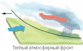 Теплый атмосферный фронт приносит понижение давления и обильные осадки. А воздух становится теплее, как у нас сейчас.