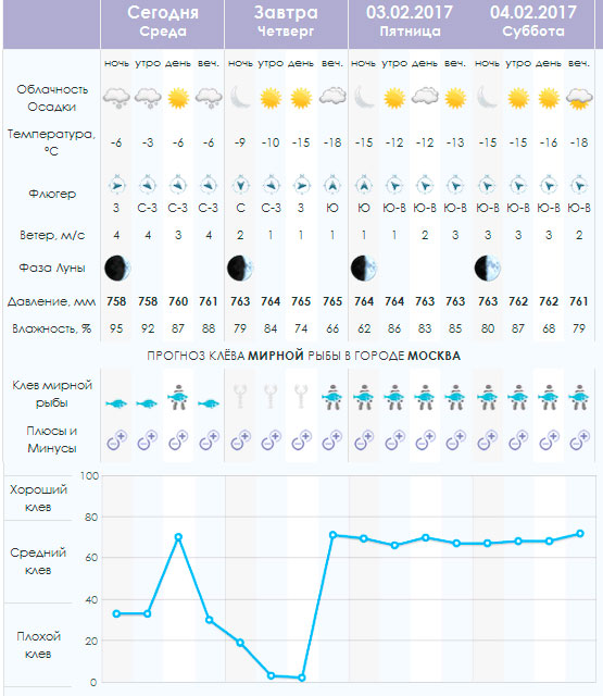 Согласно этому прогнозу 3-4 февраля ожидается устойчивая ровная погода без каких-то резких изменений - в целом это очень хорошо для клева. Температура и ветер довольно ровно-постоянные, что говорит о стабильности погоды в целом. И хотя рыба там подо льдом вряд-ли ощущает температуру воздуха и ветер, но, думаю, ощущает связанные с этими другие комплексные признаки. Постоянная облачность может означать, что основной клев будет не только утром и к вечеру, но и как-то "растянется" на дневное время.