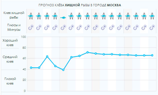 Прогноз клева здесь дается на ночь-утро-день-вечер в виде и символов, и графика, что наглядно и позволяет проще свериться с погодой - откуда вдруг начался жор или наоборот, клев прекратился?