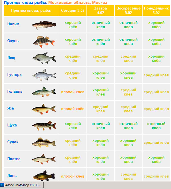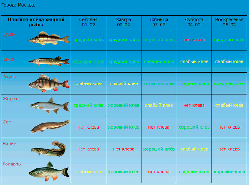 Этот сайт по Яндексу самый популярный у рыбаков. Дает прогноз клёва рыбы в городе Москва, Московская область. . учитывает температуру воды и толщину льда. По таким критериям клев практически неизменный, ведь температура воды зимой всегда 1-3оС и лишь на глубине может быть 4-5оС. Ну а лед нарастает совсем медленно. Но хоть какие-то критерии даны.