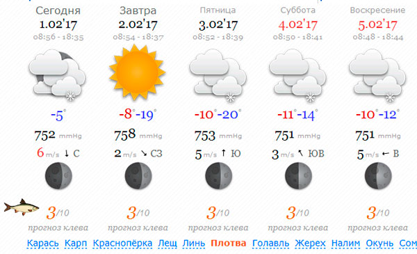 Согласно этому прогнозу 3-4 февраля ожидается устойчивая ровная погода без каких-то резких изменений - в целом это очень хорошо для клева. Температура и ветер довольно ровно-постоянные, что говорит о стабильности погоды в целом. И хотя рыба там подо льдом вряд-ли ощущает температуру воздуха и ветер, но, думаю, ощущает связанные с этими другие комплексные признаки. Облачность и небольшая освещенность могут означать, что основной клев будет не только утром и к вечеру, но и немного "растянется" на дневное время.