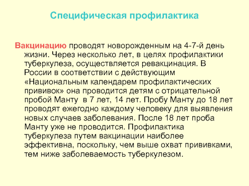 Противотуберкулезная вакцинация является главным компонентом в борьбе с детским туберкулезом в РФ. 64 страны мира в настоящее время сделали вакцинацию обязательным компонентом в работе по предупреждению развития туберкулеза.