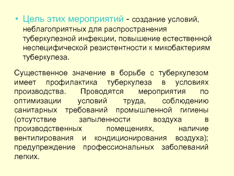 Цель этих мероприятий - создание условий, неблагоприятных для распространения туберкулезной инфекции, повышение естественной неспецифической резистентности к микобактериям туберкулеза.