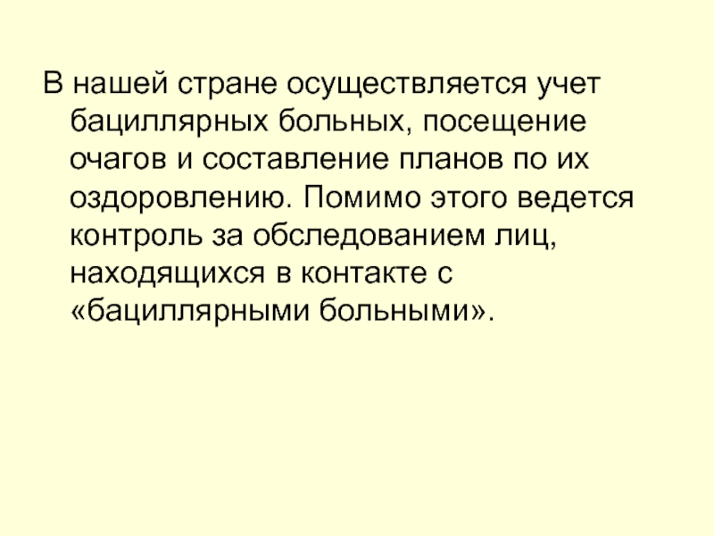 В нашей стране осуществляется учет бациллярных больных, посещение очагов и составление планов по их оздоровлению. Помимо этого ведется контроль за обследованием лиц, находящихся в контакте с «бациллярными больными».