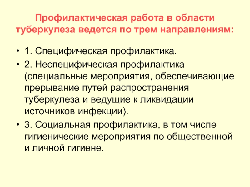 Профилактическая работа в области туберкулеза ведется по трем направлениям: