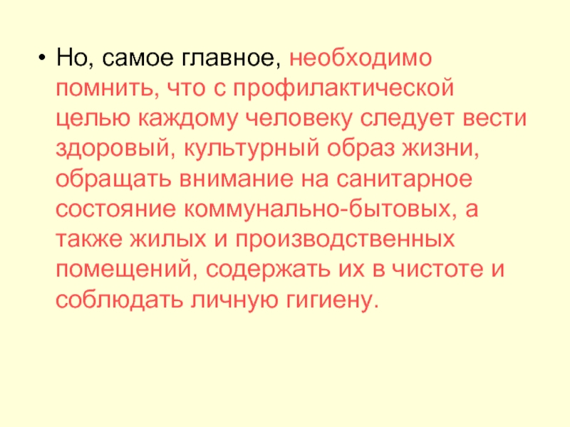 Но, самое главное, необходимо помнить, что с профилактической целью каждому человеку следует вести здоровый, культурный образ жизни, обращать внимание на санитарное состояние коммунально-бытовых, а также жилых и производственных помещений, содержать их в чистоте и соблюдать личную гигиену.