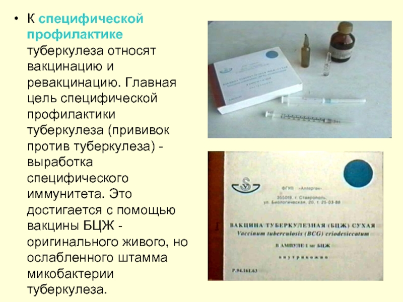 К специфической профилактике туберкулеза относят вакцинацию и ревакцинацию. Главная цель специфической профилактики туберкулеза (прививок против туберкулеза) - выработка специфического иммунитета. Это достигается с помощью вакцины БЦЖ - оригинального живого, но ослабленного штамма микобактерии туберкулеза.
