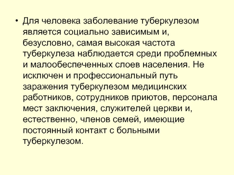 Для человека заболевание туберкулезом является социально зависимым и, безусловно, самая высокая частота туберкулеза наблюдается среди проблемных и малообеспеченных слоев населения. Не исключен и профессиональный путь заражения туберкулезом медицинских работников, сотрудников приютов, персонала мест заключения, служителей церкви и, естественно, членов семей, имеющие постоянный контакт с больными туберкулезом.