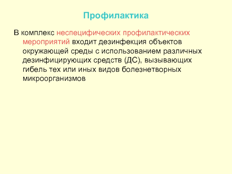 В комплекс неспецифических профилактических мероприятий входит дезинфекция объектов окружающей среды с использованием различных дезинфицирующих средств (ДС), вызывающих гибель тех или иных видов болезнетворных микроорганизмов