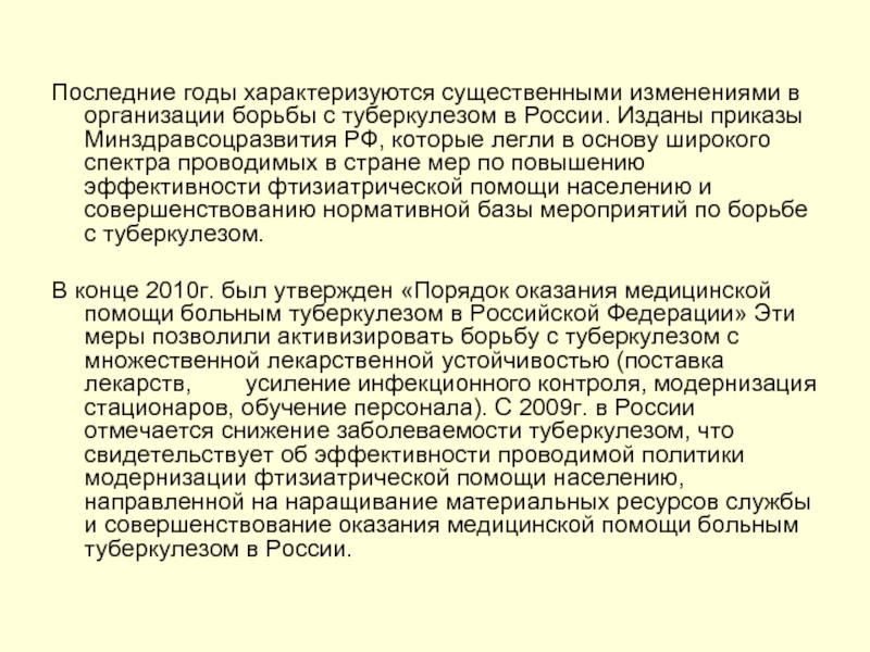 В конце 2010г. был утвержден «Порядок оказания медицинской помощи больным туберкулезом в Российской Федерации» Эти меры позволили активизировать борьбу с туберкулезом с множественной лекарственной устойчивостью (поставка лекарств, усиление инфекционного контроля, модернизация стационаров, обучение персонала). С 2009г. в России отмечается снижение заболеваемости туберкулезом, что свидетельствует об эффективности проводимой политики модернизации фтизиатрической помощи населению, направленной на наращивание материальных ресурсов службы и совершенствование оказания медицинской помощи больным туберкулезом в России.
