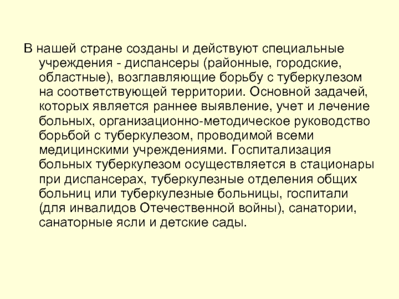 В нашей стране созданы и действуют специальные учреждения - диспансеры (районные, городские, областные), возглавляющие борьбу с туберкулезом на соответствующей территории. Основной задачей, которых является раннее выявление, учет и лечение больных, организационно-методическое руководство борьбой с туберкулезом, проводимой всеми медицинскими учреждениями. Госпитализация больных туберкулезом осуществляется в стационары при диспансерах, туберкулезные отделения общих больниц или туберкулезные больницы, госпитали (для инвалидов Отечественной войны), санатории, санаторные ясли и детские сады.