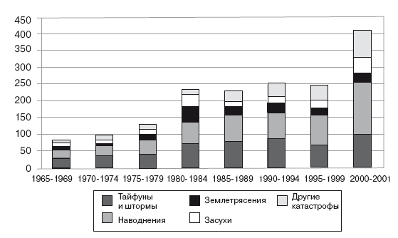 Налицо резкое увеличение общего числа катастроф (в 2000–2001 гг. среднегодовое число стихийных бедствий возросло в 5 раз по сравнению с 1965–1969 гг.), а с ним и увеличение нанесенного ими общего ущерба. Отметим большую долю в этом атмосферных причин: лепта землетрясений и оползней составляет лишь 20 %, все остальное «обеспечивает» атмосфера посредством тропических циклонов, засух и сильных дождей.