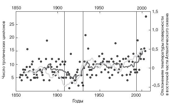 XIX века в регионах, наиболее подверженных нашествию тропических циклонов (ураганов и тайфунов), — на восточных побережьях Северной Америки и Юго-Восточной Азии. Статистика числа ураганов, начиная с 1850 г., в первом из этих регионов приведена на рис. 26, где точками отмечено число ураганов, черным — сглаженная кривая, построенная по этим данным, серым — отклонение от температуры поверхности воды в восточной тропической части Атлантического океана относительно 1930 г. (там отклонение равно нулю). Как видно из рисунка, в начале XX века число ураганов невелико, однако оно заметно возрастает в 1940-1950 гг. и особенно в период глобального потепления с 1980-х гг. Очевидна взаимосвязь обеих кривых, что неудивительно: как показали наблюдения, образование тропических циклонов происходит, когда температура поверхности океана не ниже 26 °С.