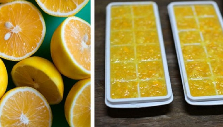 Лимонный лед. Помойте лимоны и обсушите их. Наберите в миску яблочный уксус и опустите в него плоды по очереди. Это отличный способ дезинфекции. Отправьте фрукты в морозилку примерно на 10-12 часов. Утром просто натрите каждый замороженный плод на мелкой терке , а полученную массу поместите в лоток для льда. Отправьте лоток в морозилку.