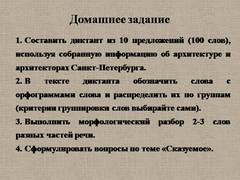 Домашнее задание Составить диктант из 10 предложений (100 слов), используя собранную информацию об архитектуре и архитекторах Санкт-Петербурга . В тексте диктанта обозначить слова с орфограммами слова и распределить их по группам (критерии группировки слов выбирайте сами). Выполнить морфологический разбор 2-3 слов разных частей речи. Сформулировать вопросы по теме «Сказуемое».