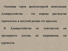 В Адмиралтействе не чувствуется ни чрезмерного усилия, ни напряжения, ни суровости. Оно проникнуто спокойствием и выражением непобедимой силы, которые всегда были свойственны лучшим произведениям русской архитектуры. Зеркально гладкие стены сочетаются с величественными колоннадами и широкими арочными пролетами. Здание украшено золотым шпилем. В Адмиралтействе есть и праздничность и нарядность. (105 слов.)