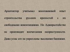 Слайд 15 Архитектор учитывал многовековой опыт строительства русских крепостей с их свободными композициями. Но Адмиралтейство не производит впечатления неприступности. Даже углы его не укреплены высокими башнями.