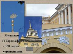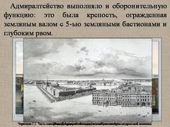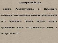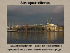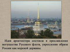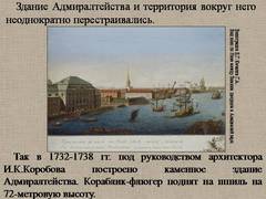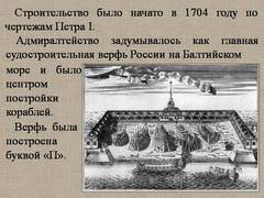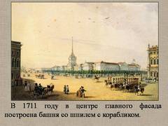 Информация для учителя. Адмиралтейство – один из известных и красивейших памятников нашего города. Строительство было начато в 1704 году по чертежам Петра I. Адмиралтейство задумывалось как главная судостроительная верфь России на Балтийском море и было центром постройки кораблей. Верфь была построена буквой «П». Во время царствования Петра I со стапелей Адмиралтейства сошло 262 военных корабля. Строительство кораблей продолжалось до 1844 года. Первый корабль с Адмиралтейской верфи был спущен на воду 29 апреля 1706 года. Адмиралтейство выполняло и оборонительную функцию: это была крепость, огражденная земляным валом с 5-ью земляными бастионами и глубоким рвом. В 1711 году в центре главного фасада построена башня со шпилем с корабликом. Здание Адмиралтейства и территория вокруг него неоднократно перестраивались. Так в 1732 - 1738 гг. под руководством архитектора И.К. Коробова построено каменное здание Адмиралтейства. Кораблик-флюгер поднят на шпиль на 72-метровую высоту. В начале 19 века перестройка здания велась под руководством знаменитого архитектора Андреяна Дмитриевича Захарова. Комплекс был полностью перестроен. Здание стало трехэтажным, украшенное 56 статуями, 11 барельефами и 350 украшениями. Идея архитектора состояла в прославлении могущества Русского флота, укреплении образа России как морской державы.