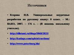 Егорова Н.В. Универсальные поурочные разработки по русскому языку: 8 класс. – М.: ВАКО, 2007. – 176 с. – (В помощь школьному учителю). http://diletant.ru/blogs/5068/2833/ http://kudago.com/spb/attractions/ http://www.peterburg.biz/ Источники