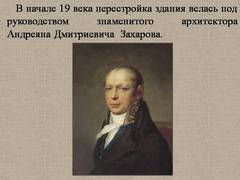 Слайд 9 В начале 19 века перестройка здания велась под руководством знаменитого архитектора Андреяна Дмитриевича Захарова.