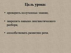 Цель урока: проверить полученные знания; закрепить навыки лингвистического разбора; способствовать развитию речи.