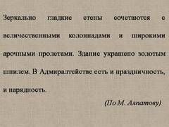 Зеркально гладкие стены сочетаются с величественными колоннадами и широкими арочными пролетами. Здание украшено золотым шпилем. В Адмиралтействе есть и праздничность, и нарядность. (По М. Алпатову)