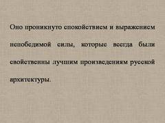 Слайд 17 Оно проникнуто спокойствием и выражением непобедимой силы, которые всегда были свойственны лучшим произведениям русской архитектуры.