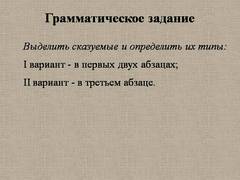 Грамматическое задание Выделить сказуемые и определить их типы: I вариант - в первых двух абзацах; II вариант - в третьем абзаце.