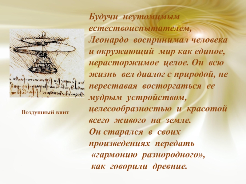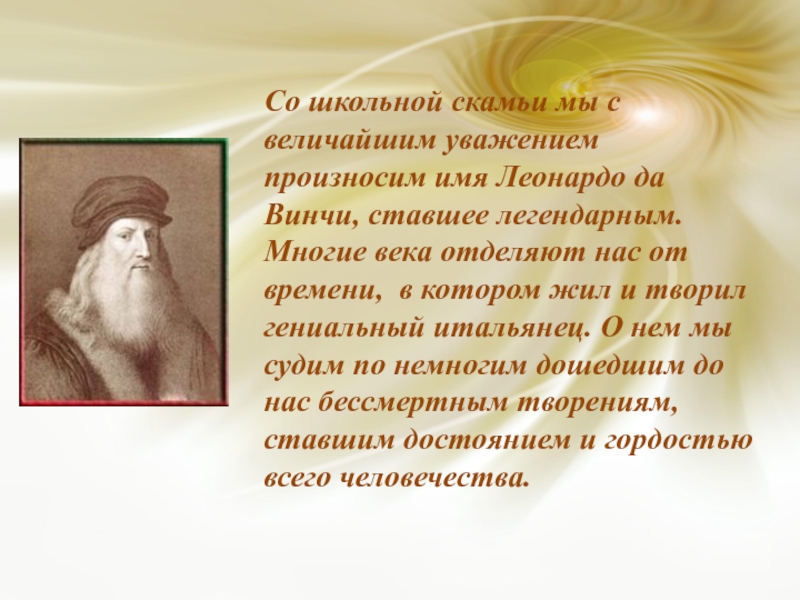 Презентация на тему Презентация на тему Легендарный Леонардо да Винчи, предмет презентации: Физика. Этот материал содержит 10 слайдов. Красочные слайды и илюстрации помогут Вам заинтересовать свою аудиторию. Для просмотра воспользуйтесь проигрывателем, если материал оказался полезным для Вас - поделитесь им с друзьями с помощью социальных кнопок и добавьте наш сайт презентаций ThePresentation.ru в закладки!