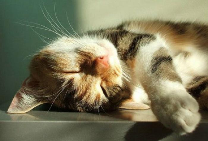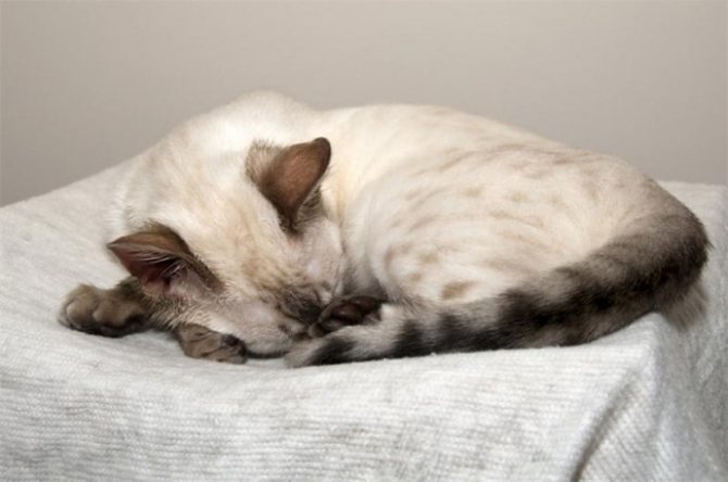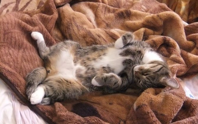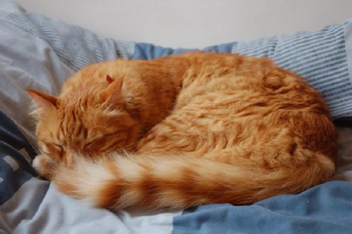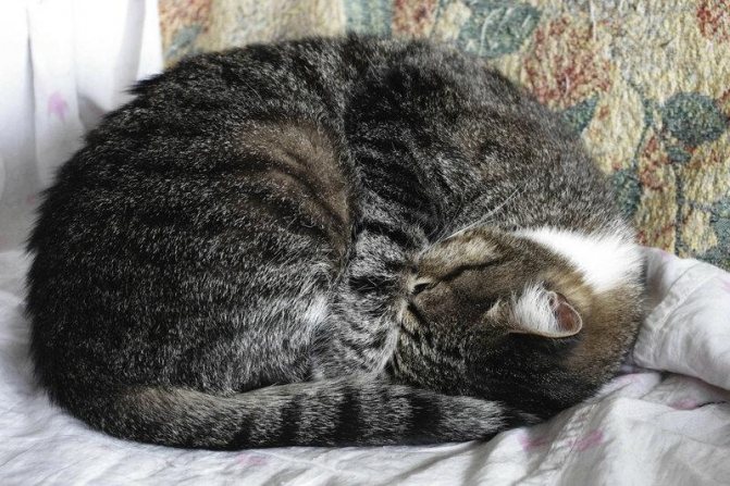В тёплом помещении кошка прячет голову под живот, спит, свернувшись калачиком — наступят морозные дни.