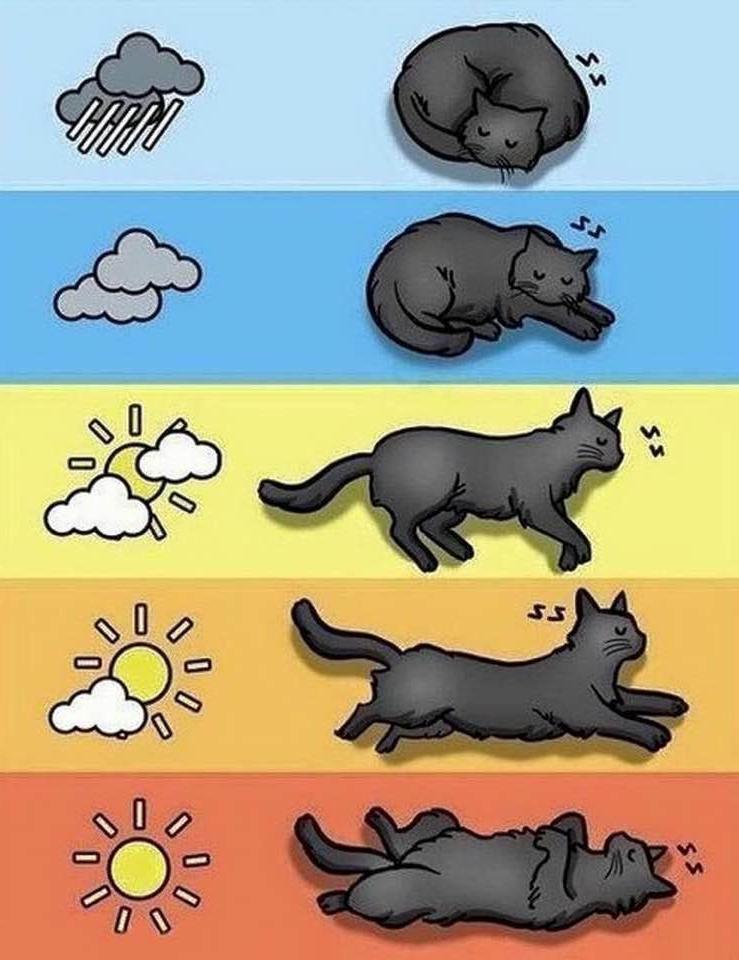 Если предстоит резкое потепление, кошка во сне образует полукруг. К небольшому потеплению животное выгнется чуть сильнее. Если же предвидится жаркая и солнечная погода, тело кошки вытягивается в ровную линию. Животное будет подолгу сидеть у окна или проситься на улицу, если будет хорошая погода. Есть старая русская примета: когда кошка начинает кататься по половицам – жди тепла.