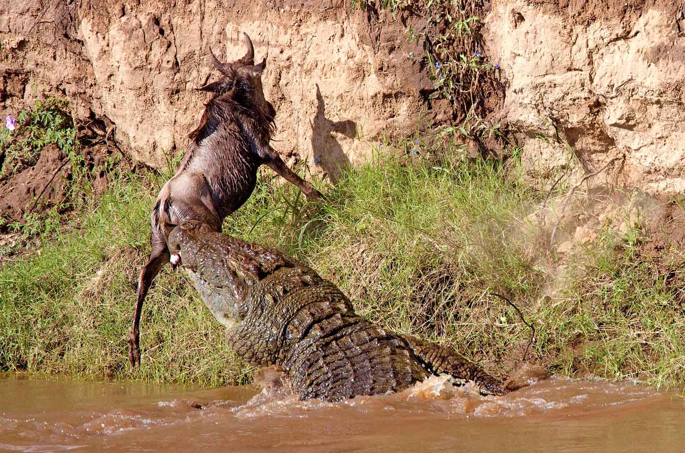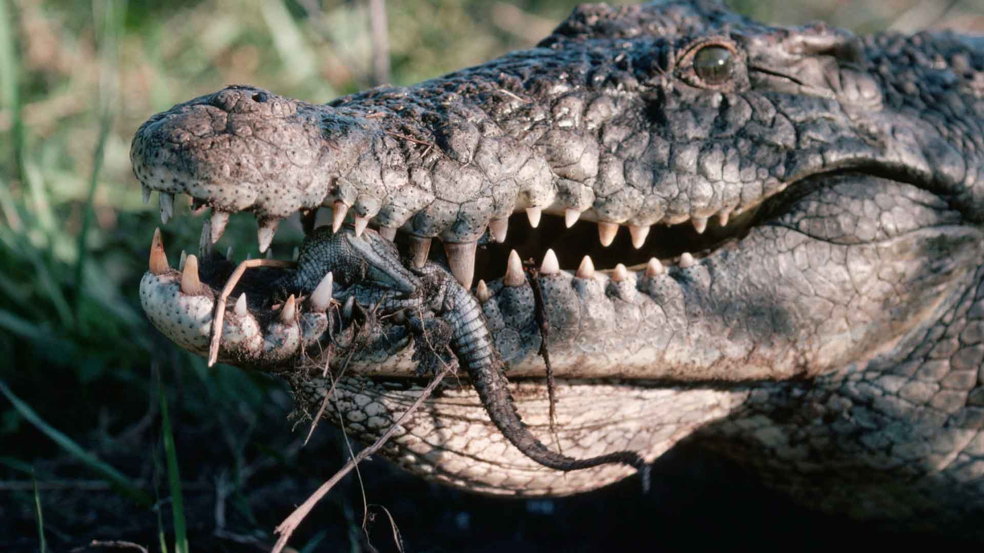 Крокодилы не «различают званий» и нападают не только на беззащитных копытных, но и на львов, бегемотов и даже слонов. Челюсти крокодила обладают огромной силой. К тому же у него особое строение зубов: они у крокодила расположены несимметрично, так, что крупным зубам верхней челюсти соответствуют мелкие нижней. Таким образом зубы смыкаются между собой как замок, вырваться из его пасти практически невозможно.