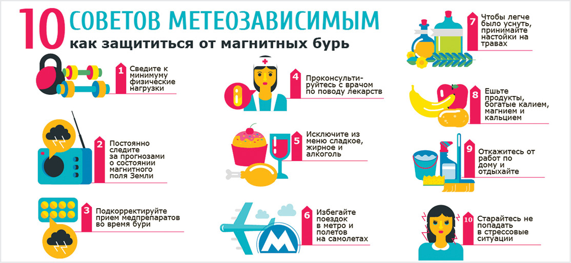 Если самочувствие ухудшается на фоне магнитных бурь, то в этот период лучше не заниматься тяжелой умственной и физической работой. Чтобы легче перенести период вспышек на Солнце, полезно хорошо высыпаться, чаще бывать на свежем воздухе, не злоупотреблять тяжелой едой и принимать витамины. Кроме того, за несколько дней до начала магнитной бури полезно заняться спортом, отказаться от вредных привычек и перейти на здоровую диету.