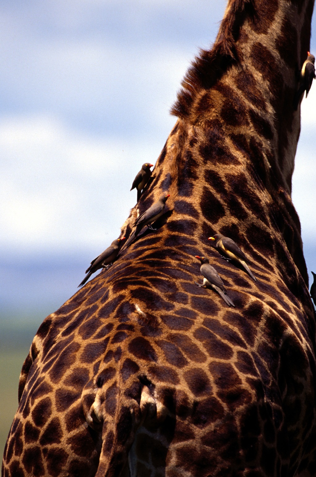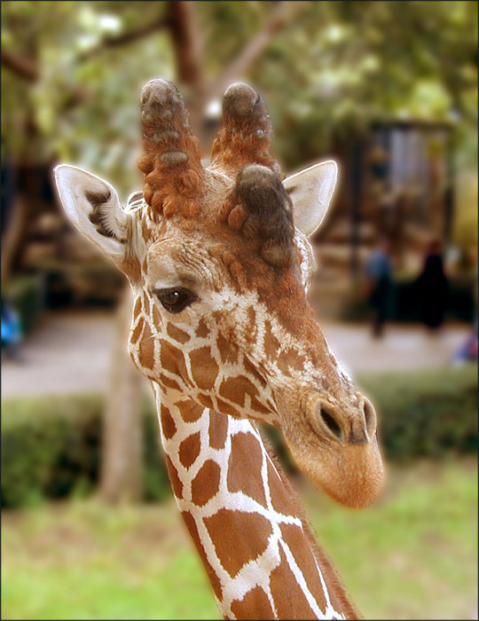Большинство жирафов двурогие, но иногда встречаются животные с 4-мя и даже с 5-ю рожками на голове. Его желтовато-рыжая шкура украшена темно-коричневыми округлыми пятнами. В Африке не найти 2-ух одинаковых жирафов. Шкура каждого раскрашена по-своему и индивидуальна, как отпечатки пальцев человека.