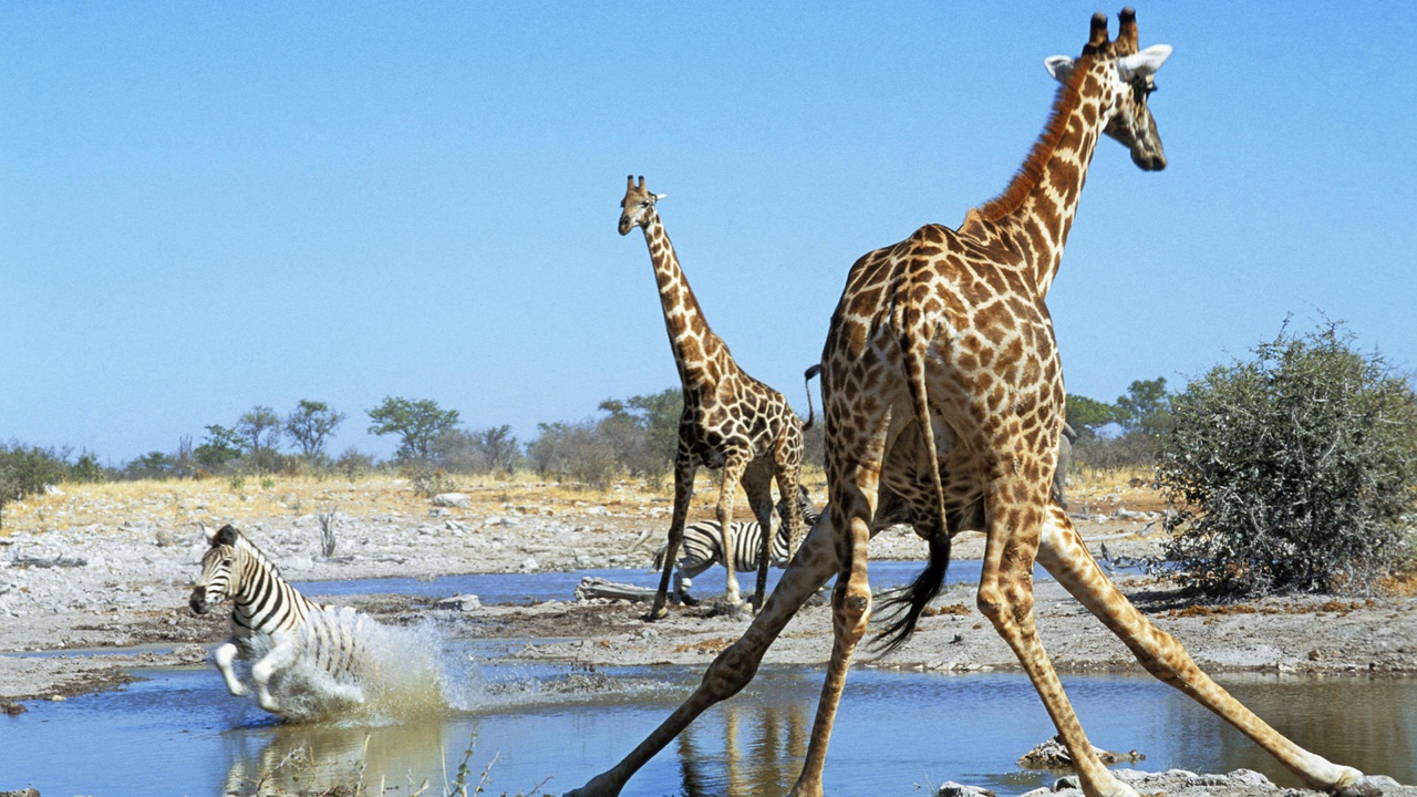 У жирафа очень длинные и тонкие ноги. Однако это не мешает ему быстро бегать и даже прыгать в высоту на полтора метра. Только вот водоемы жираф обходит стороной: они ему пока еще не покорились.