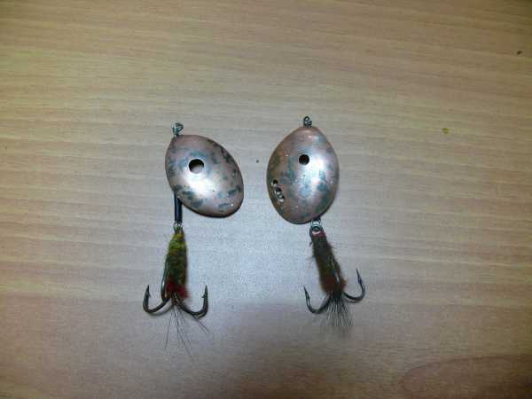 Наиболее подходящие — от 25 до 40 мм в длину и от 15 до 20 мм в ширину. Ими ловят рыбу в тихих и глубоких местах при недальних забросах. Тяжелые блесны из числа колеблющихся в основном пригодны для ловли на быстром и умеренном течениях и в более глубоких водоемах. Такие блесны пользуются популярностью у спиннингистов, выезжающих на Аргунь, Шилку и Витим. Эти блесны своей игрой имитируют вялую рыбу, как бы убегающую от хищника. На песчаном и на галечном дне, где обычно держится пескарь и молодые рачки, окраска которых подходит под цвет нечищеной блёсны из латуни — нужно, следовательно, применять желтую латунную блесну. Там, где водится чебак и гольян, который при движениях обнажает свое бело-серебристое брюхо, хищную рыбу ловят на белую блесну. Если в реке живет безобидная рыбешка сорога тело ее отдает темно-медным цветомиспользуйте блесну из красной меди. На мелко-песчаном дне при медленном ведении желтой латунной блесны, имитирующей прячущегося в песок пескаря, никак не удержаться от схватки ленку.