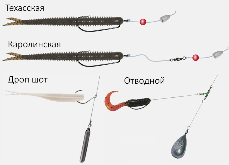 Если ведется ловля на джиг, в тандеме с искусственными наживками используются тяжелые джиг-головки или же грузила, если применяются тактики ловли на дроп-шот или отводной поводок.