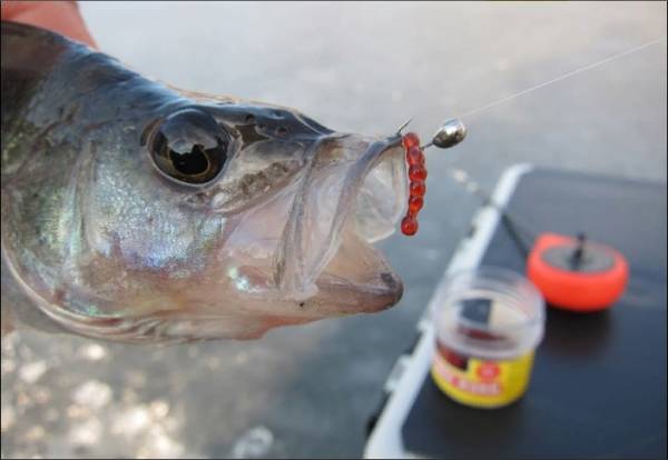 Мелкий кормовой мотыль, который обычно применяют для привлечения окуня, самая подходящая насадка, причем запах испортившегося мотыля его не отпугивает.