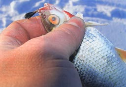 Даже в январе плотва остается достаточно бойкой, поэтому при вываживании нельзя ослаблять леску, иначе возможен сход. Но и форсировать тоже не стоит, чтобы не вырвать крючок изо рта подсеченной добычи.