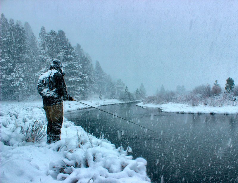 Обильных снегопадов при сильных морозах обычно не бывает, но если в течение нескольких дней непрерывно идет снег, выезд лучше перенести на более благоприятное время. Однако замечено, что небольшой снежок зачастую инициирует повышение активности обитателей водоема, равно как и «окна» без осадков среди снегопадов.