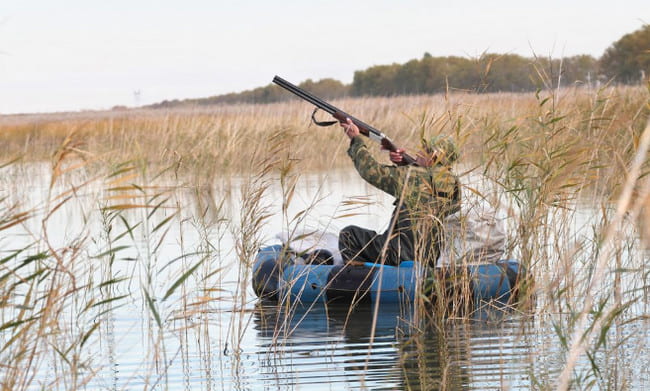 Обычно с лодки охотятся вдвоём: один управляет, второй – стоит наготове с ружьём. Двигаться следует против ветра. Очень важно помнить про технику безопасности, чтобы избежать несчастных случаев или «купания» в водоёме. Тем паче, что после подобных водных процедур будет утеряно ружье.