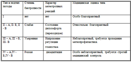Таблица 4. Медицинская оценка типов погоды (Поволоцкая Н.П., Скляр А.П. 1991)