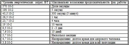 При кратковременной работе человеческому организму достаточно энергетических ресурсов углеводов. Если работа выполняется достаточно длительное время необходимая энергия вырабатывается за счет распада жира из жировых депо организма. Максимальная продолжительность работы и уровни энергетических затрат сведены в таблицу 5.