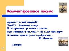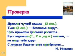 12 Дремл…т ч…ткий камыш(?). Тиш(?) — безлюдье в…круг. Ч…ть приметна тр…пинка р…систая. Куст заденеш(?) пл…чом, — на л…цо тебе вдруг С листьев брызнет р…са с…р…бристая. И. Никитин Проверка