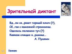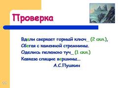 10 Вд…ли св…ркает горный ключ (?), Сб…гая с каменной стремнины. Оделись пеленою туч (?) Кавказа спящие в…ршины. А. Пушкин Проверка