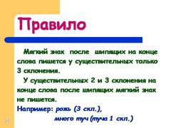 3 Мягкийзнакпослешипящихнаконце слова пишется усуществительныхтолько 3склонения. У существительных 2 и 3 склонения на конце слова после шипящих мягкий знак не пишется. Например:рожь (3 скл.), много туч (туча 1 скл.)